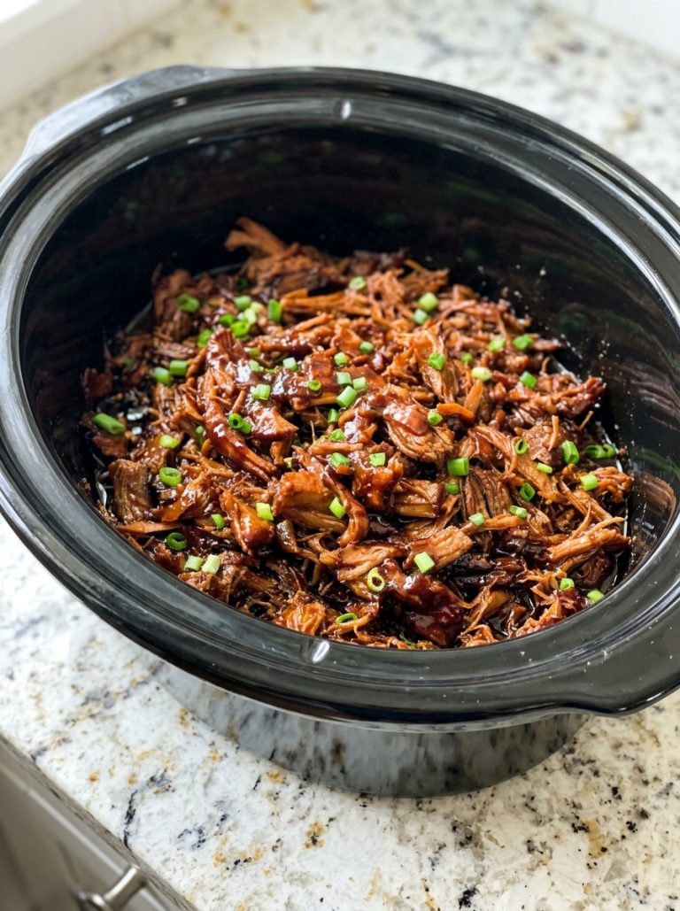 Whisk the sauce ingredients together in a bowl and pour everything over the pork. Cook on LOW for eight to ten hours or HIGH for five to six. It’s done when a fork slides in and the meat just falls apart on its own. If it’s still resisting, it needs more time. There’s no shame in that — different cuts, different cookers. Don’t rush it.