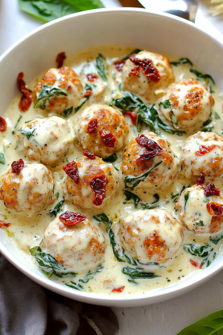 Baked Chicken Ricotta Meatballs with Spinach Alfredo Sauce