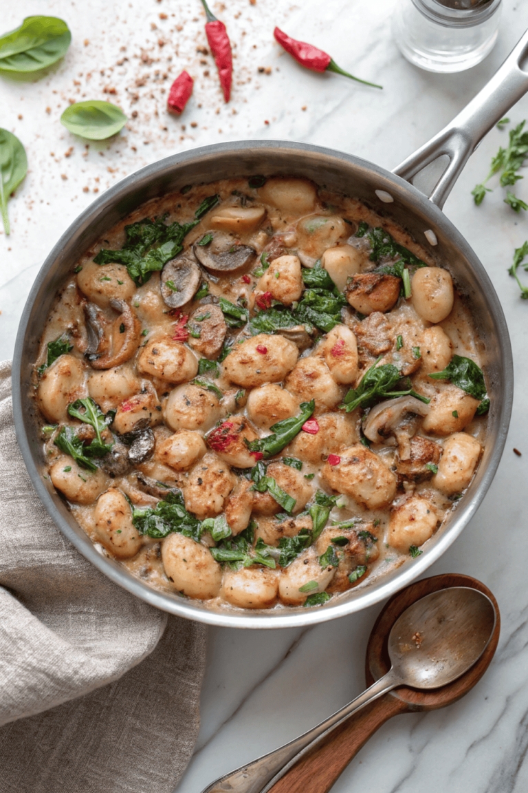 This creamy spinach and mushroom gnocchi is one of those dinners that feels indulgent but comes together in just 20 minutes, all in one pan. The gnocchi cooks right in the Sauce, the spinach wilts in at the end, and somehow it tastes like something you’d order at a restaurant on a night out.