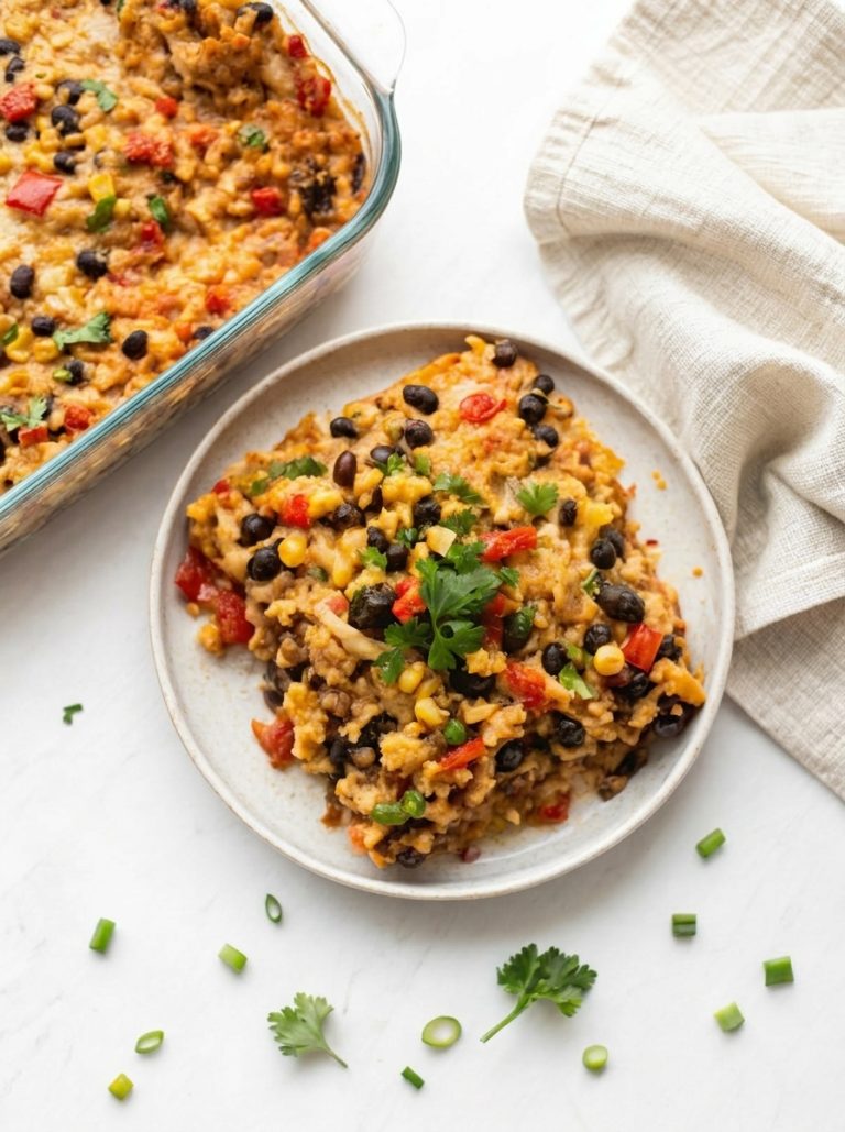 This chicken burrito casserole has everything you love about burritos — seasoned rice, tender shredded chicken, black beans, corn, green chilies, and melted Monterey Jack — all baked together in one dish. It’s easy enough for a busy weeknight and good enough that everyone comes back for seconds.