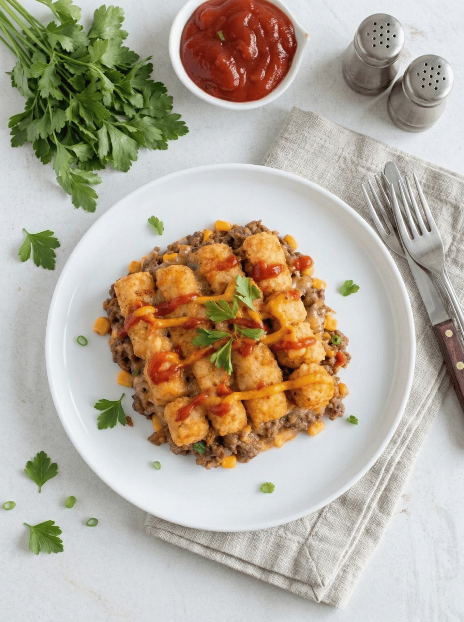 Leftovers go in the fridge covered with foil or in a container with a lid, and they’ll keep for about three or four days. Reheat in the oven at 350°F if you want the tots to stay crispy — microwave works too but they get soft, which some people don’t mind.