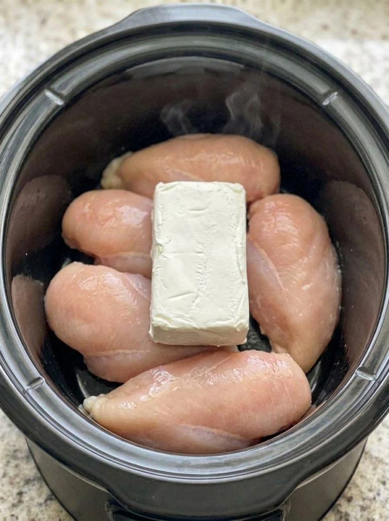 This Slow Cooker ranch Chicken is my go-to when I need dinner to handle itself. Four ingredients — chicken breasts, cream cheese, a ranch packet, and broth — go into the slow cooker, and a few hours later you’ve got tender shredded chicken in a rich, creamy sauce that tastes like you actually tried.