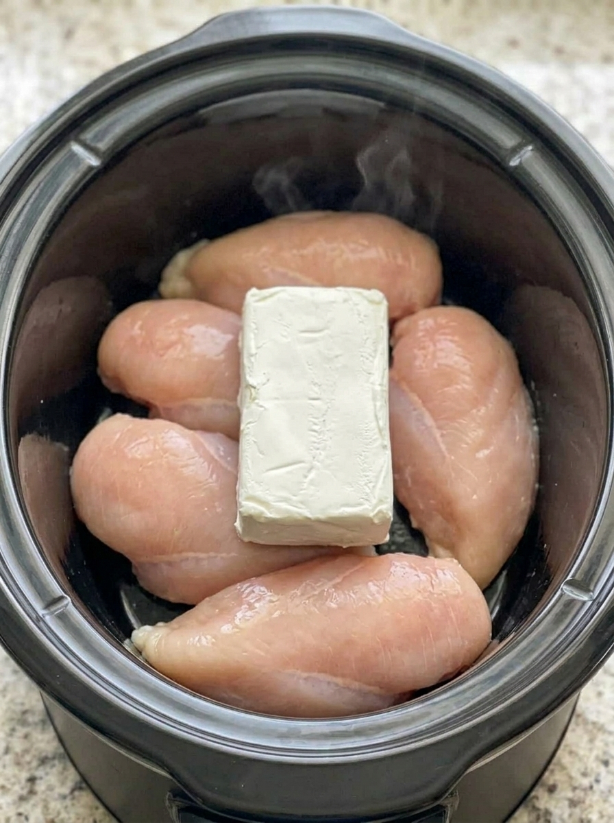 Layer the chicken breasts in the bottom of your slow cooker — I have a 6-quart oval one that I’ve had for going on fifteen years, the lid is slightly cracked and I keep meaning to replace it, but it works — in as even a layer as you can manage. If they won’t all fit flat, that’s okay. Sprinkle the ranch packet right over the top of the chicken. Pour the broth around the sides, not directly on the chicken, so you don’t wash all that seasoning off before it has a chance to do anything. Then place the cream cheese block right in the center, on top of everything. It looks a little absurd, like you’ve forgotten a step, like surely there’s more to it. There isn’t.