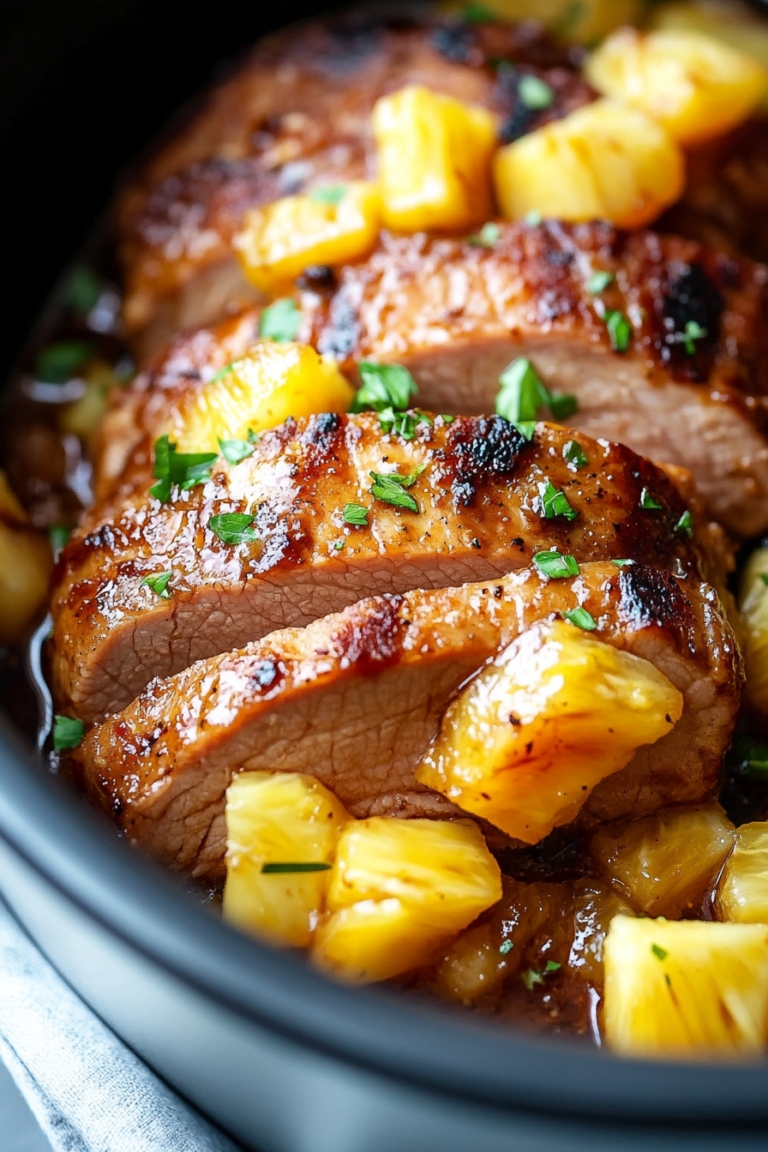 You know what saves me? There’s something quietly magical about tossing a few everyday things into my slow cooker, pressing “Low,” and letting it bubble away while I handle the rest of my to-dos (or, let’s be real, sneak in a little couch time). That’s why this Slow Cooker Pineapple Pork Loin is high up on my “dinner-heroes” list—it basically cooks itself, and when it’s done you’re rewarded with juicy, fall-apart pork in a sweet, tangy, garlicky sauce loaded with caramelized pineapple. It’s the kind of comfort food that feels like it took effort, but was (shhhh) completely hands-off.