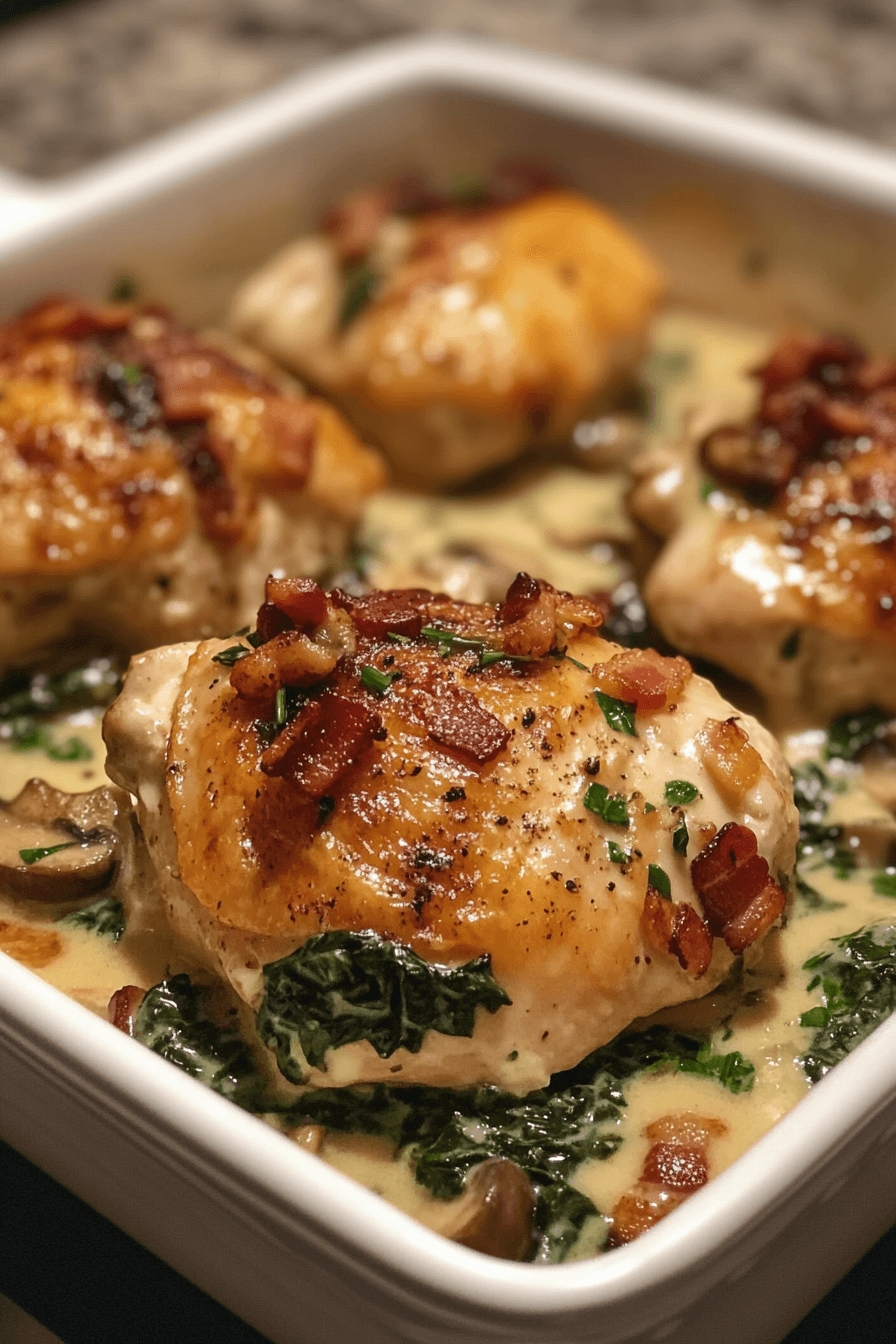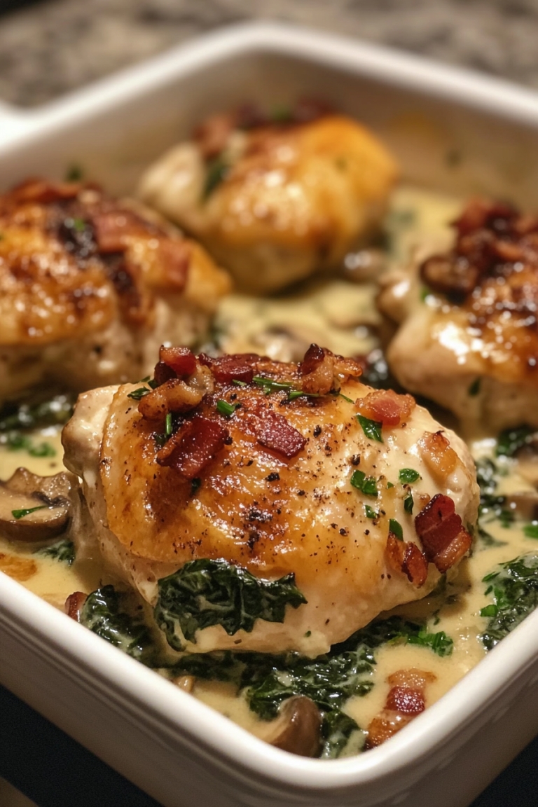 This recipe has changed the game at my house. It’s one of those meals that ends up tasting decadent but is so very easy to throw together; perfect for weeknight dinners. Crispy bacon, Chicken golden-seared and umami-laden mushrooms, all awash in a creamy sauce with fresh spinach, combine in a symphony of flavors… you’ll want to linger over each bite. The best part? It all comes together in one pan, which makes cleanup minimal and flavor maximal! I remember the first time I made this for my family — it was being asked for seconds, and the pan was scraped clean in no time. If you need a new MVP recipe that’s guaranteed to impress, you’ve found it!