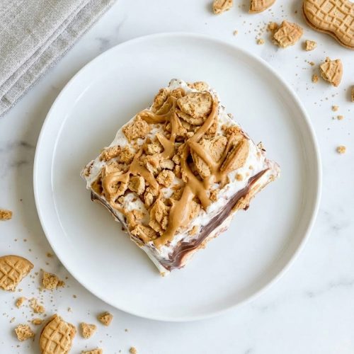 This indulgent no-bake peanut butter crunch lasagna layers crisp cookies, creamy cheesecake filling, rich chocolate pudding, and fluffy whipped topping. Finished with crushed cookies and a drizzle of peanut butter, it’s a decadent dessert perfect for parties and make-ahead treats.