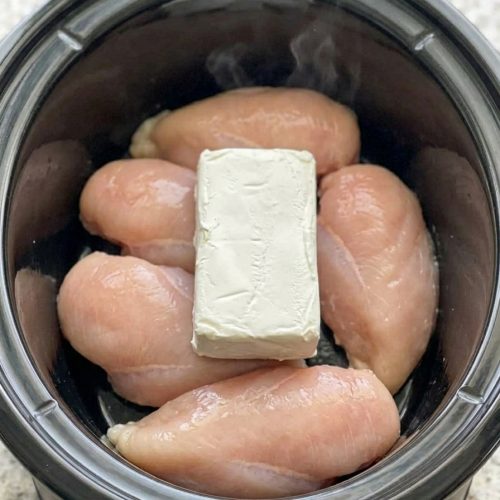 Sprinkle ranch seasoning evenly over chicken. Pour broth around the sides of the slow cooker and place cream cheese block in the center on top.